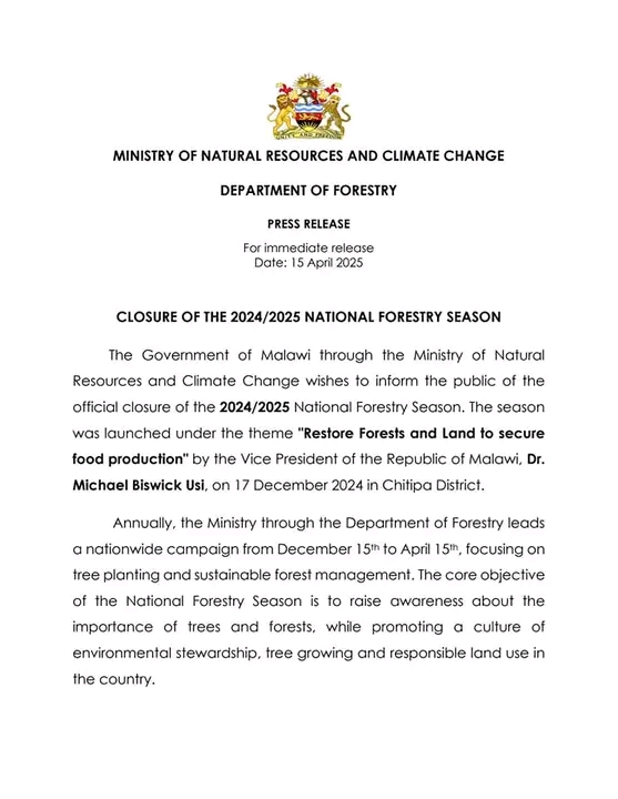 Unduna owona za chilengedwe ndikusintha kwa nyengo kudzera ku nthambi yoona za nkhalango, walengeza kutseka kwa nyengo yodzala mitengo ya mchaka cha 2024/2025 yomwe idatsekulilidwa ndi wachiwiri kwa mtsogoleri wa dziko lino, Dr. Micheal Usi pa 17 December chaka chatha ndipo yatsilizika pa 15 April chaka chino.